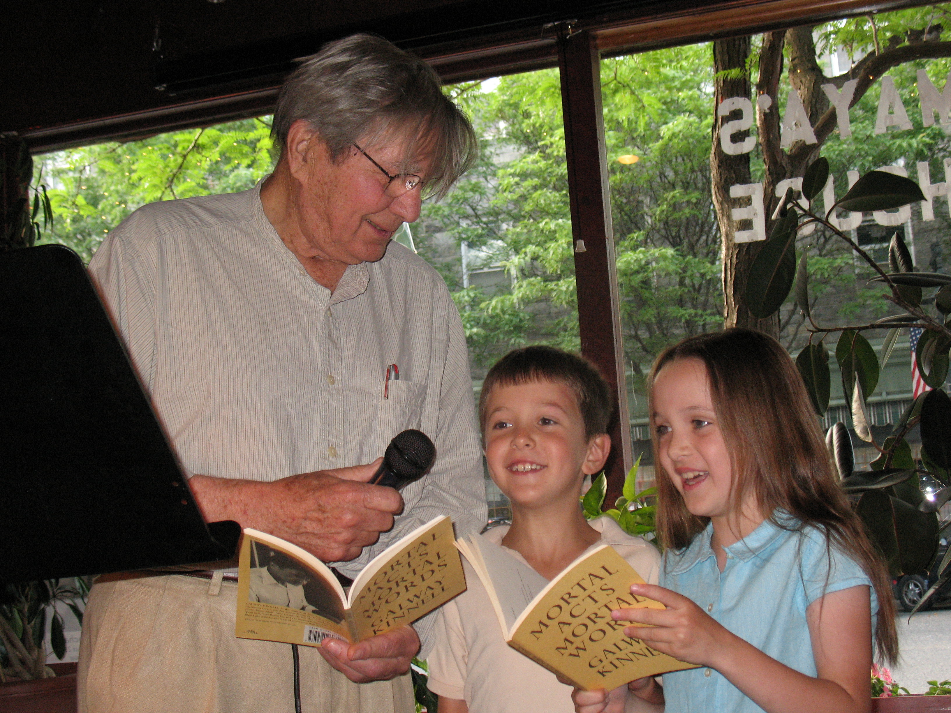 The pictures below are of the Collected Poets Series reading with Galway. Directly below, his grandchildren perform with him. Then, there’s Lea Banks, CPS’s founder & impresario, with Tim Mayo, poet, previous CPS reader, and committee member. Finally, there’s me, Lea, and poet Susie Patlove. All of the pictures were taken by Laura Rodley, who is a wonderful poet in her own right, and whose chapbook is now available for pre-order at Finishing Line Press! But more on that later…