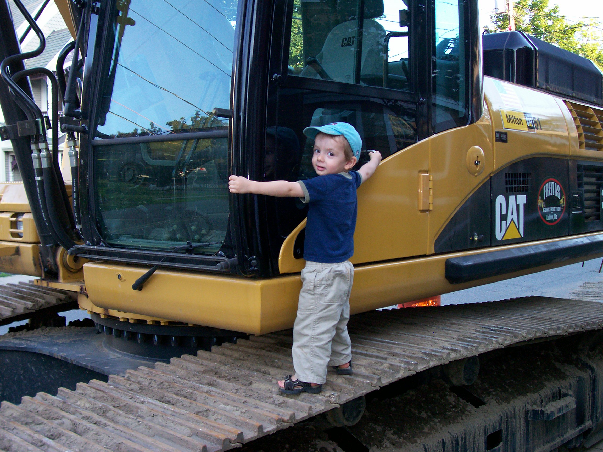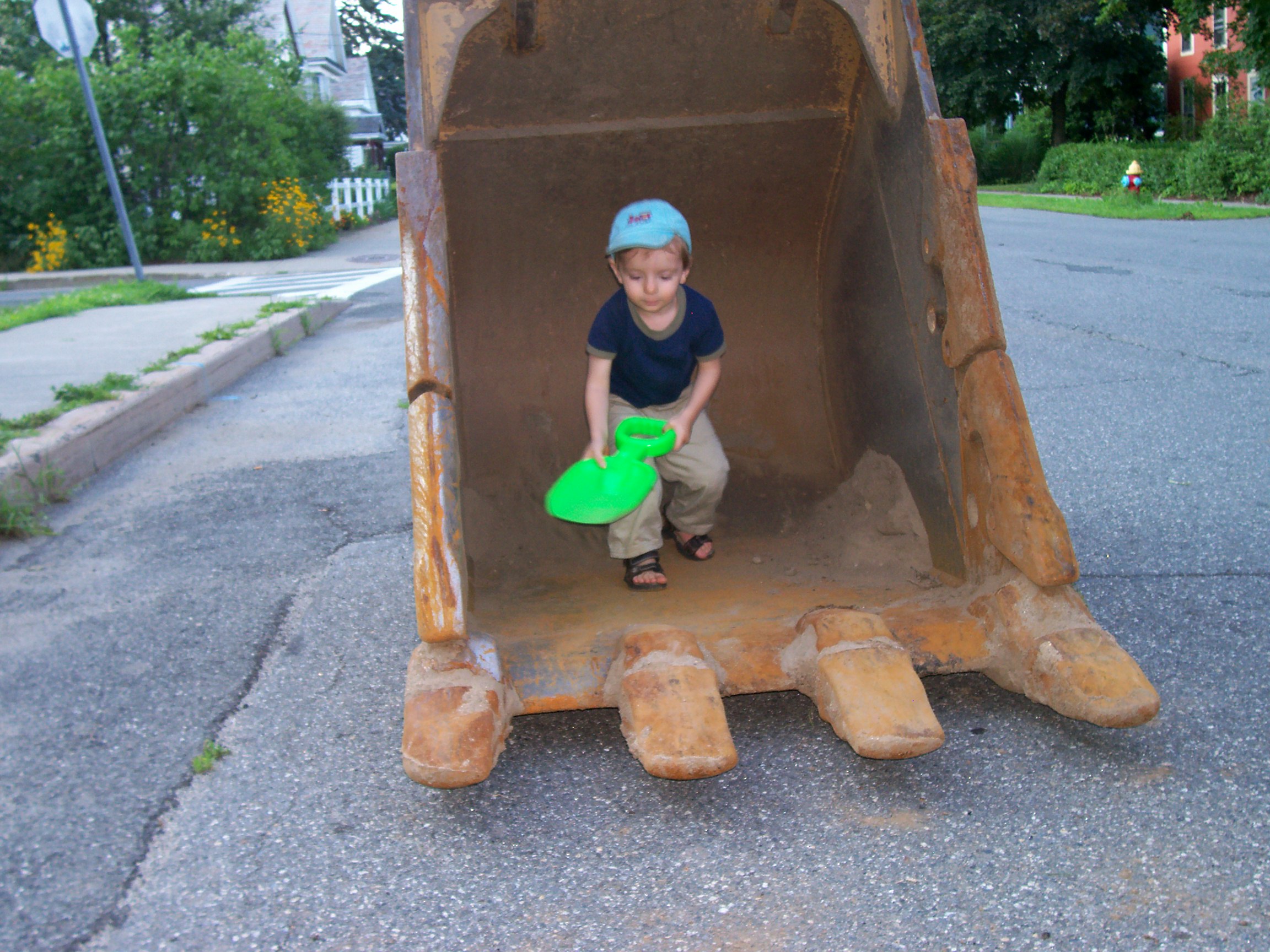 Also of great excitement tonight is the appearance of a gigantic tractor, a big digger, parked just outside our door — construction is beginning on our street on Monday, so I guess in front of our building seemed as good a spot to park it as any. Vincent is just beside himself, he thinks it’s his now.