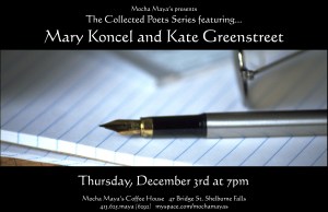 This Thursday, December 3, at 7:00 pm, the Collected Poets Series is pleased to present Mary Koncel and Kate Greenstreet! Please note our new start time.