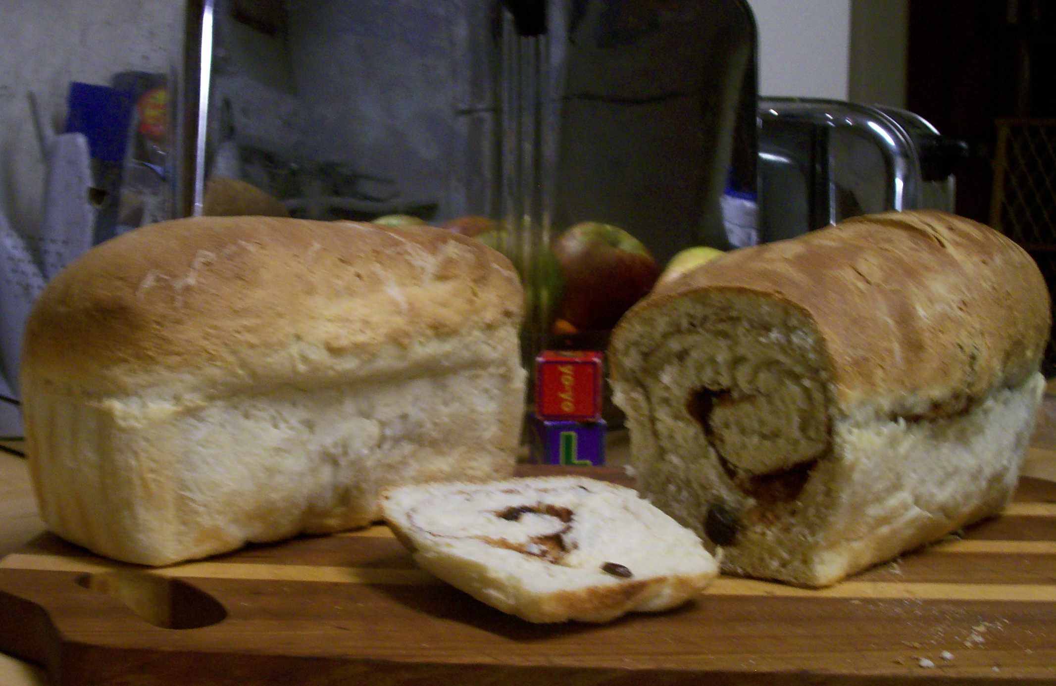 Definitely for the best, however. Last storm we bartered a loaf of fresh-baked bread for our neighbor snow-blowing our driveway. But I didn’t have enough flour or time to bake this weekend. That came today. And check out that loaf on the right — an experiment, cinnamon raisin. I don’t know about the nutritional value, but seriously, nothing beats the taste of home-made bread.