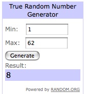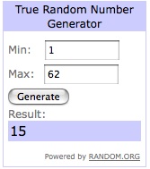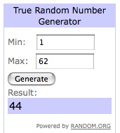 Because, wow!, there ended up being so many entrants, my original plan of just putting names in a hat went right out the window. I took one of Kelli’s suggestions and used the True Random Number Generator over at Random.org.